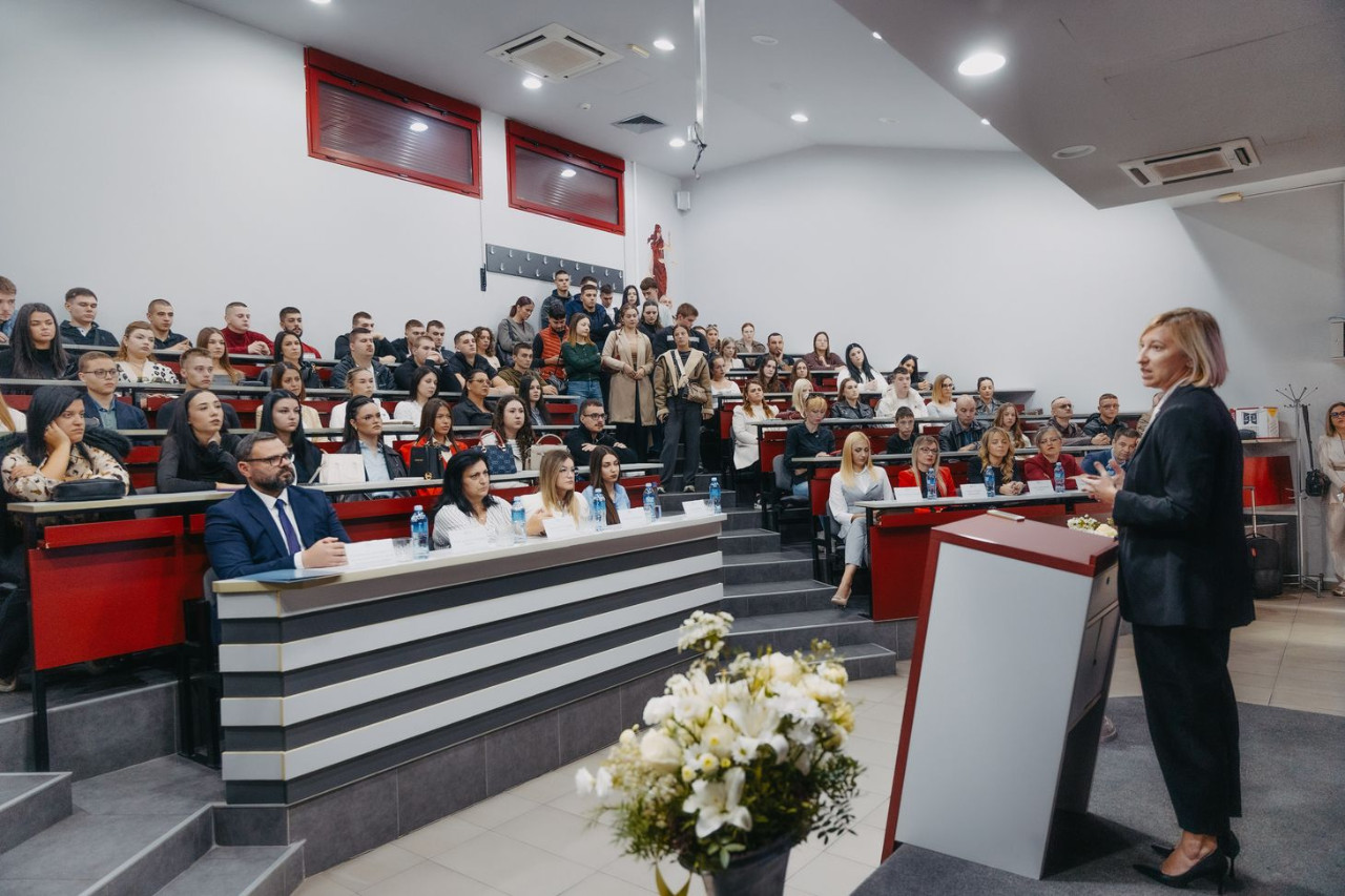 U svom obraćanju prof. dr Jelena Stojšić Dabetić, pozdravila je novu generaciju studenata i poželela im dobrodošlicu. " Izbor koji ste napravili je jako važan. Vi ste mladi ljudi na koje svi računamo da ćete biti motor promena, pokretač dobrog, koji će praviti promene i napretke u vašoj široj i užoj zajednici. Izborom Pravnog fakulteta za privredu i pravosuđe niste izabrali samo mesto gde ćete slušati predavanja, polagati ispite, već i mnogo više. Mi smo tu ne samo da vas naučimo kako da budete dobri pravnici, kako da ovladate pravničkom profesijom, kako da uđete u proces naučnog istraživanja, već i da vam pomognemo da sve svoje vrednosti, potencijale, vrline, što bolje iskoristite, ostvarite, spoznate, kako biste postali kvalitetni i samosvesni mladi ljudi, lideri, koji će biti na ponos sami sebi, svojoj porodici, našem fakultetu“ – istakla je prof. dr Jelena Stojšić Dabetić, i generaciji 2025/26. poručila da ne traže prečice do znanja, već da biraju put koji će im obezbediti postojana i prava znanja, jer samo takva mogu biti temelj budućih pravnika i vrhunskih lidera koje ovo društvo treba da ima.